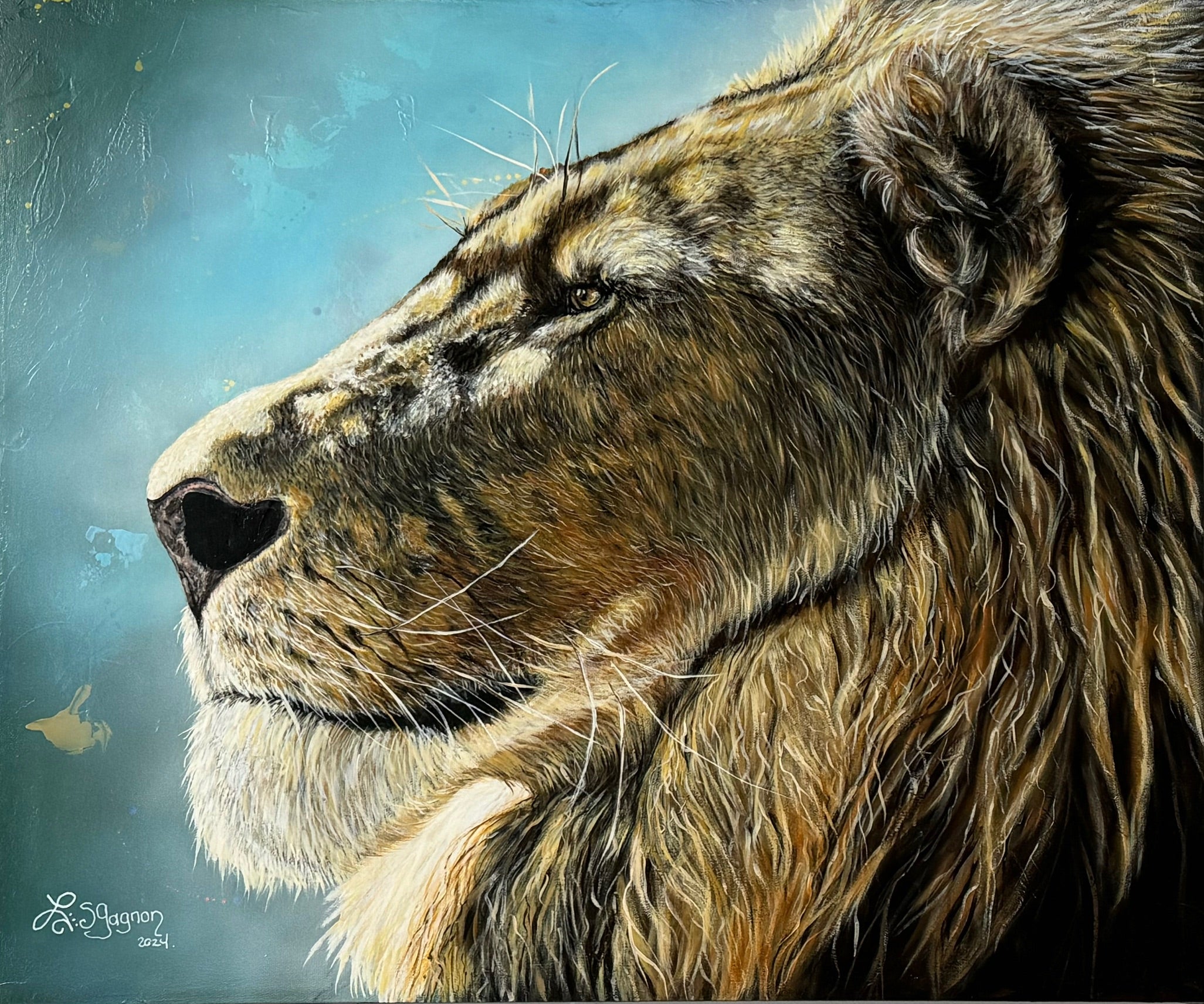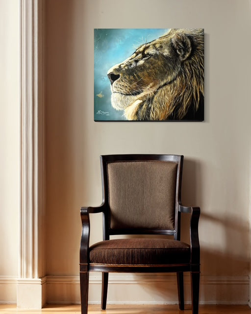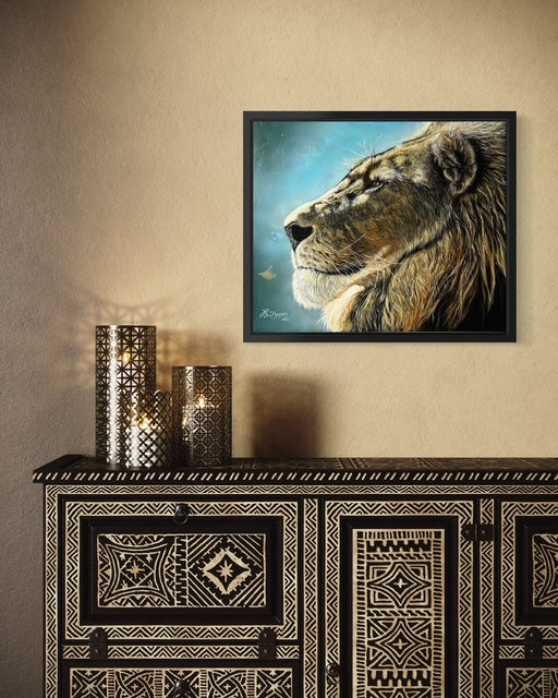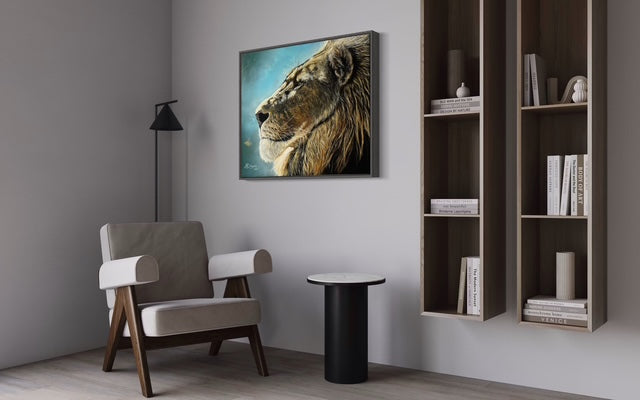 Cette toile érige le lion en souverain de l'espace, sans ostentation mais avec une présence qui commande le regard. Le regard chargé de sagesse, la mâchoire étendue et la crinière dorée forment un tout qui respire la dignité et la force tranquille. Dans un jeu de lumière et de texture, l'image invite à une observation calme et bienveillante, comme une promesse de sagesse et de noblesse qui s'invite dans votre intérieur.