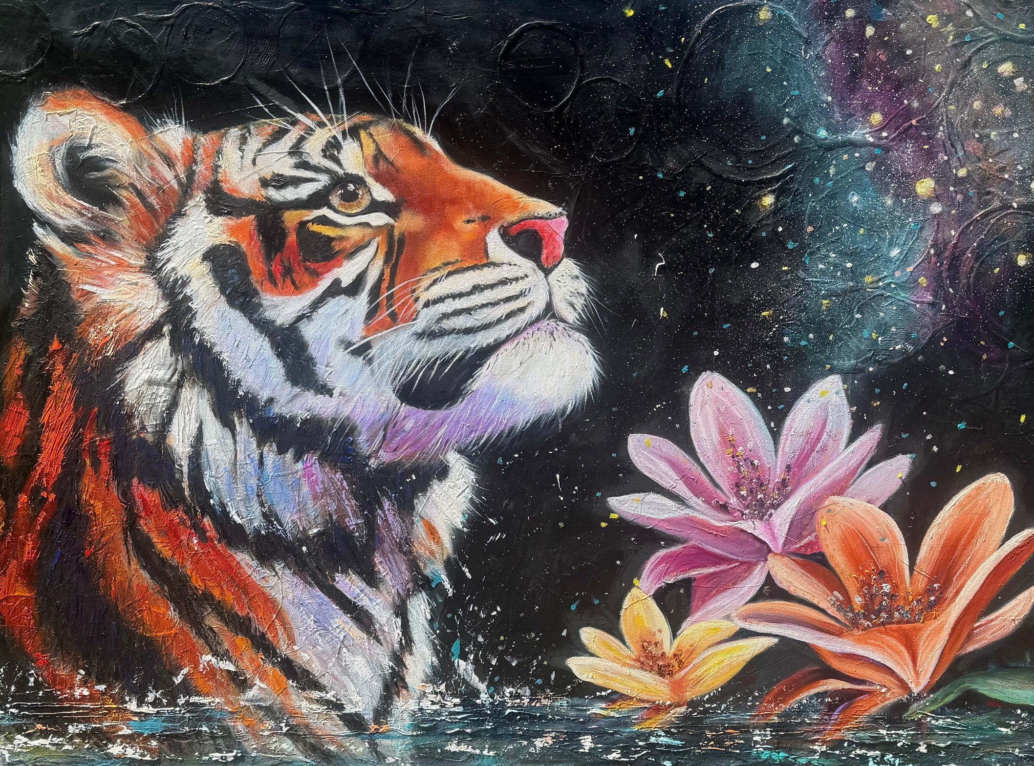 Découvrez cette œuvre captivante où un tigre majestueux, inspiré par la constellation qu’il contemple, symbolise la puissance et la sagesse du cosmos. Son regard fixé vers les étoiles évoque une connexion profonde entre la terre et l’univers. À ses côtés, des fleurs délicates aux teintes douces contrastent avec le fond étoilé, créant un équilibre entre force et poésie.